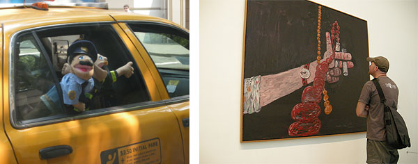 Puppets in a cab, Fifth Ave, NYC; Philip Guston paintings from the Edward R. Broida collection, MOMA